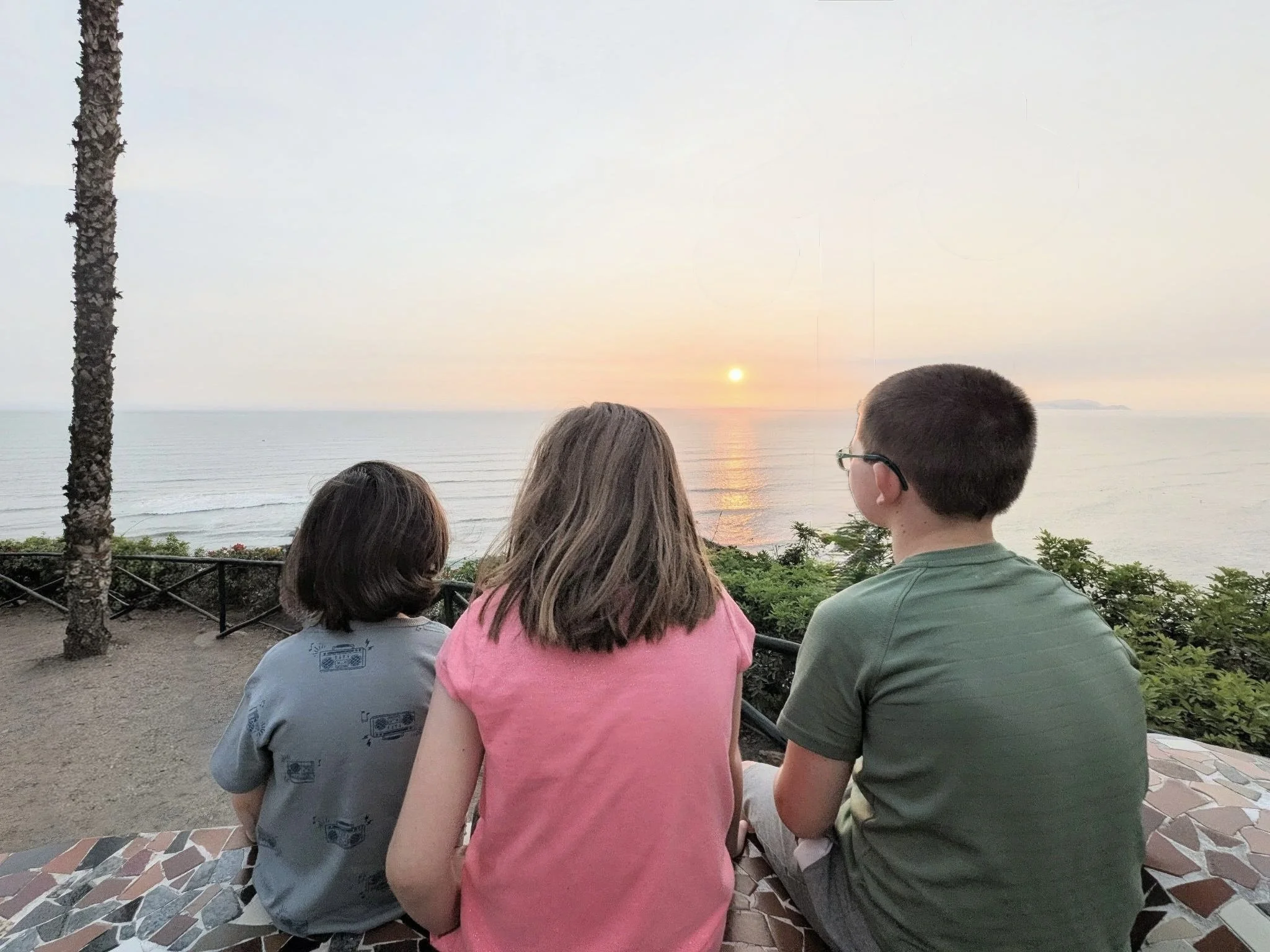 Three kids looking at the sunset over the Pacific Ocean in Lima, Peru.